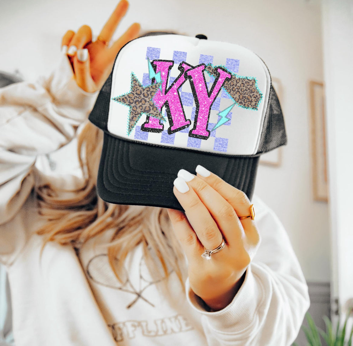 KY (Retro Leopard Checkered Glitter Stitched State Abbreviation) - DTF