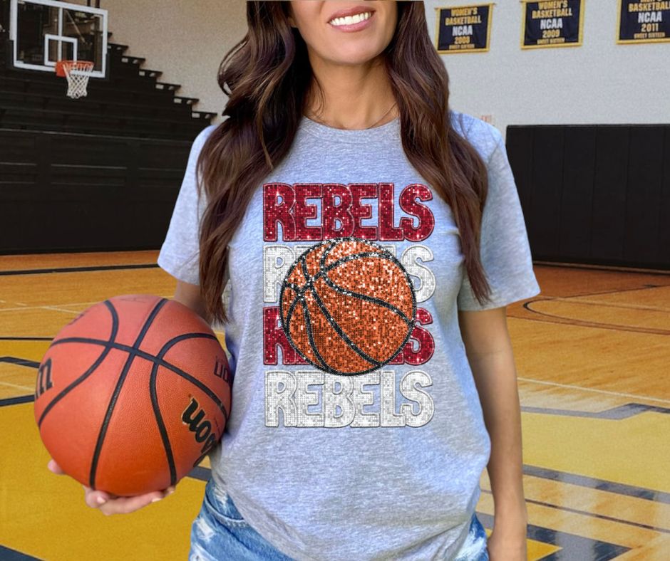 Rebels - Red/White (Stacked Basketball Faux Sequins) - DTF